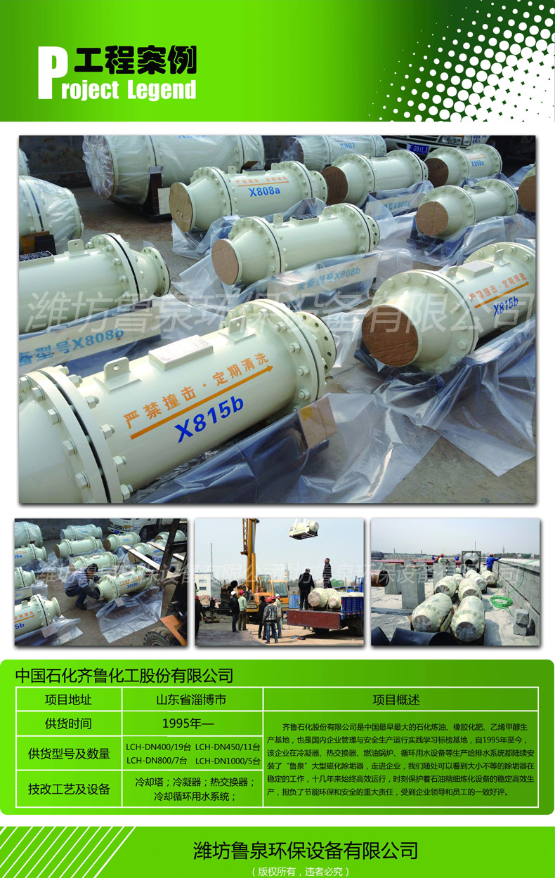 齊魯石化股份有限公司是中國石化煉油、橡膠化肥、乙烯甲醇生產(chǎn)基地,也是國內(nèi)企業(yè)管理與安全生產(chǎn)運行實踐學(xué)習(xí)標榜基地,自1995年至今,該企業(yè)在冷凝器、熱交換器、燃油鍋爐、循環(huán)用水設(shè)備等生產(chǎn)給排水系統(tǒng)都陸續(xù)安裝了“魯泉”大型磁化除垢器,走進企業(yè),我們隨處可以看到大小不等的除垢器在穩(wěn)定的工作,十幾年來始終高效運行,時刻保護著石油精細煉化設(shè)備的穩(wěn)定高效生產(chǎn),擔(dān)負了節(jié)能環(huán)保和安全的重大責(zé)任,受到企業(yè)領(lǐng)導(dǎo)和員工的一致好評。