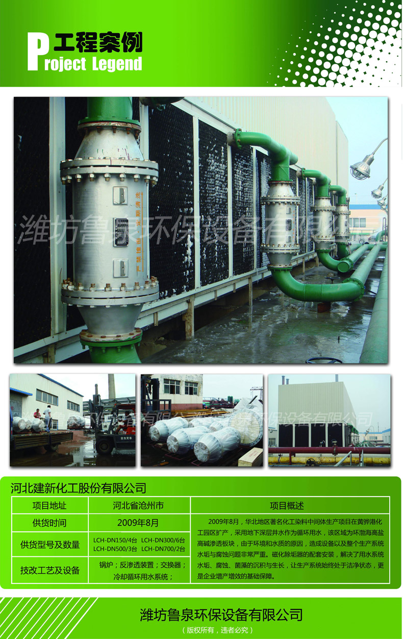 2009年8月,華北地區(qū)著名化工染料中間體生產(chǎn)項(xiàng)目在黃驊港化工園區(qū)擴(kuò)產(chǎn),采用地下深層井水作為循環(huán)用水,該區(qū)域?yàn)榄h(huán)渤海高鹽高堿滲透板塊,由于環(huán)境和水質(zhì)的原因,造成設(shè)備以及整個(gè)生產(chǎn)系統(tǒng)水垢與腐蝕問題非常嚴(yán)重。磁化除垢器的配套安裝,解決了用水系統(tǒng)水垢、腐蝕、菌藻的沉積與生長(zhǎng),讓生產(chǎn)系統(tǒng)始終處于潔凈狀態(tài),更是企業(yè)增產(chǎn)增效的基礎(chǔ)保障。